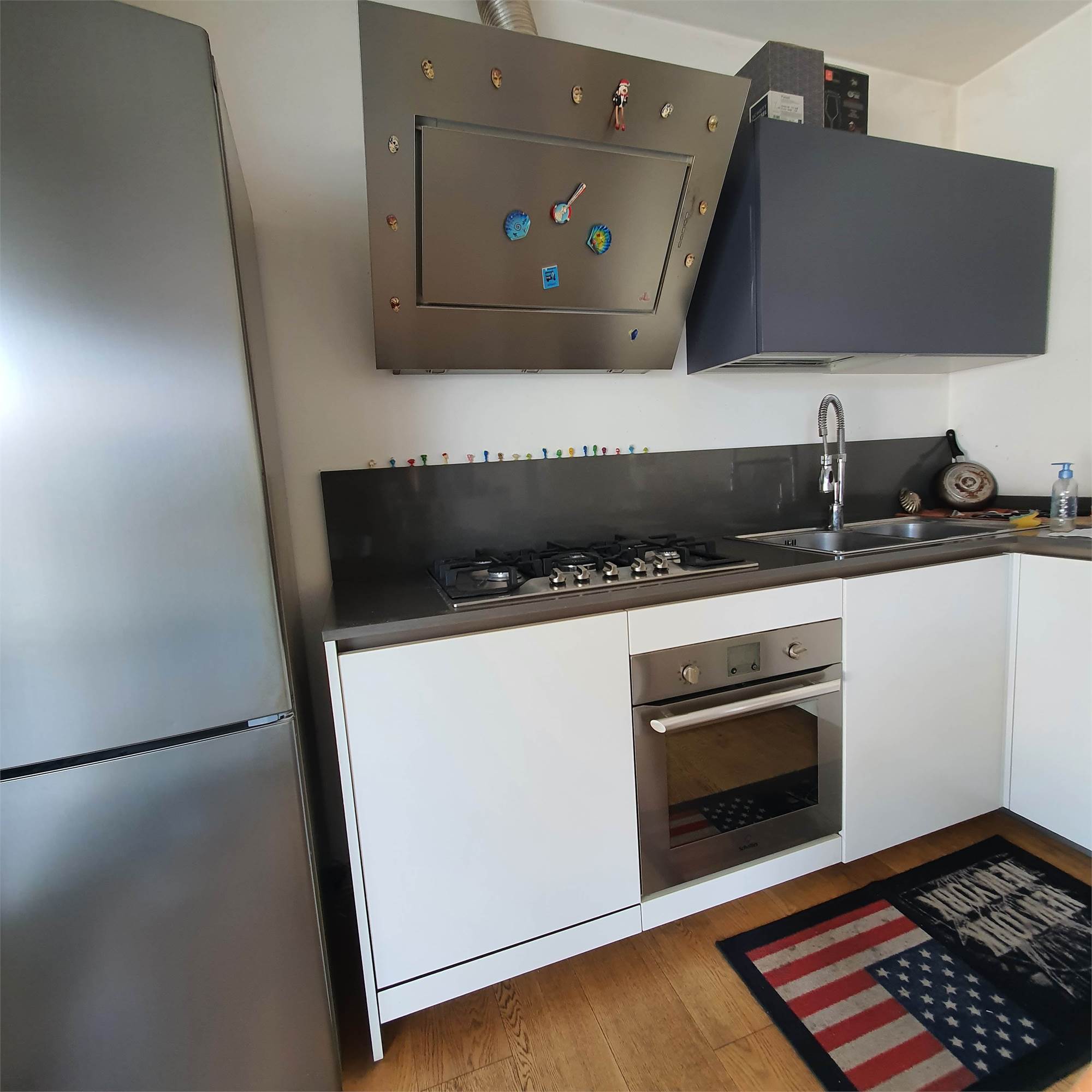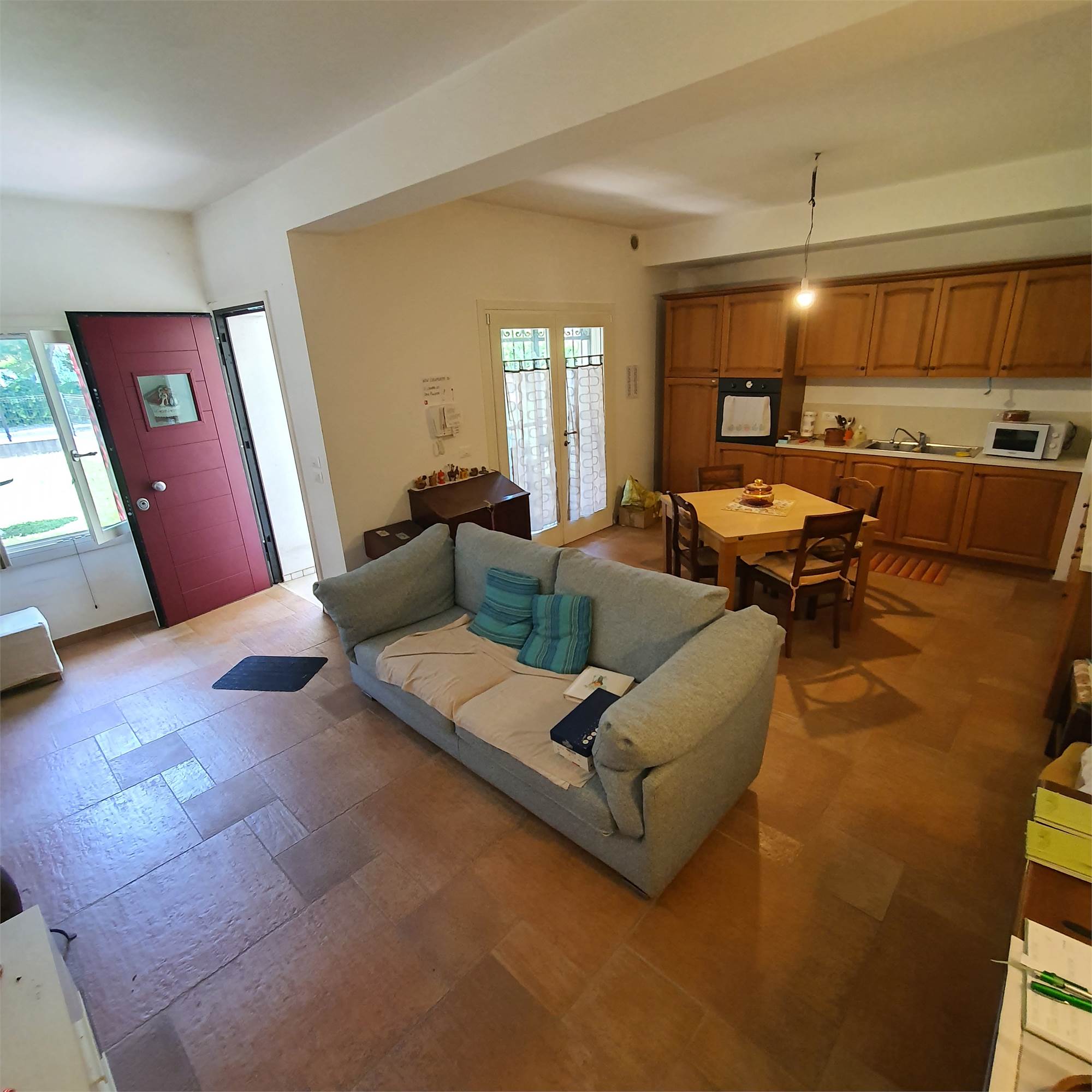 Al piano terra, un grazioso appartamento con ingresso, zona giorno open space soggiorno-cucina, disimpegno, due camere da letto e un bagno.